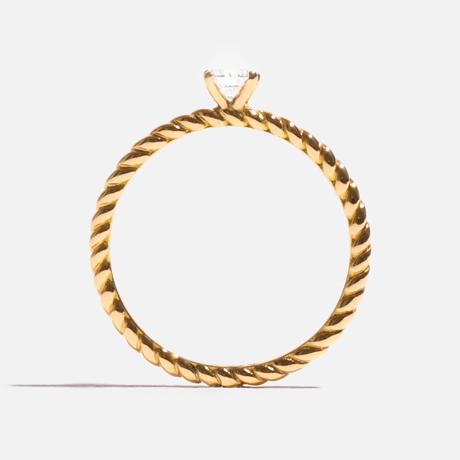 Gedrehter Solitaire Verlobungsring aus Gold, der das Licht auf besondere Weise reflektiert. Dieser zeitlose Solitaire Ring, schimmert mit einem synthetischen Diamanten im Brillantschliff, gehalten von vier feinen Krallen in einer eleganten Krappenfassung. Verfügbar ist der gedrehte Verlobungsring in den Goldfarben Gelbgold, Roségold und Weißgold. Für verantwortungsvolle Eleganz wird der nachhaltige Verlobungsring ausschließlich aus zertifiziertem Fairmined Gold gefertigt.